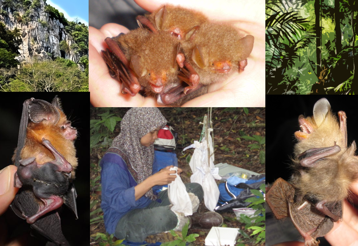 Ain hard at work in Malaysia, assessing reproductive status of cave- (bottom left) and forest-roosting (bottom right, top center) bats.