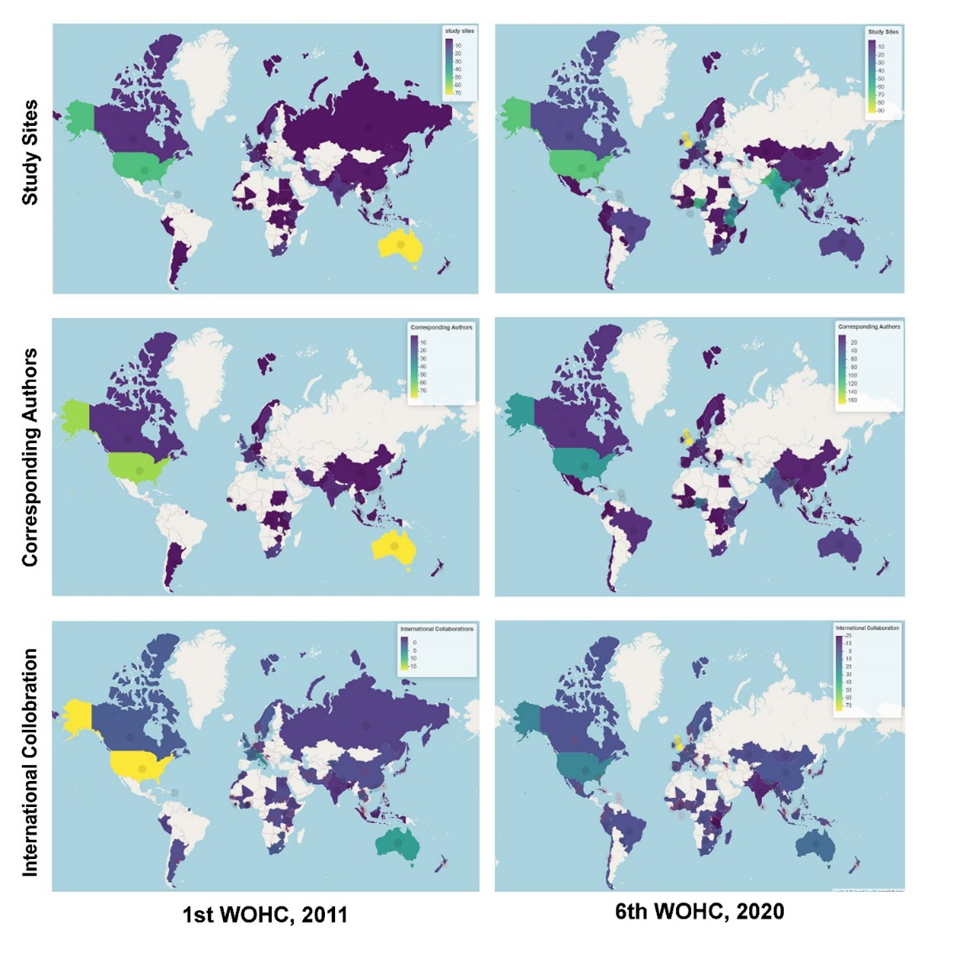 Geographic distribution of One Health research. Comparison of abstract distributions from 1st and 6th World One Health Congress based on study sites, affiliation of corresponding authors, and international collaborations. Contributions to international collaborations were calculated as the difference between the number of studies conducted in the country and the number of corresponding author affiliations from the country. Negative and positive values indicate sink (received collaboration) and source (extended collaboration) of One Health research. Source countries such as US and UK for the 1st and 6th WOHC are indicated by yellowish green color while sink countries such as India and Pakistan for both Conferences are indicated by dark blue color. Check out our interactive web maps here!