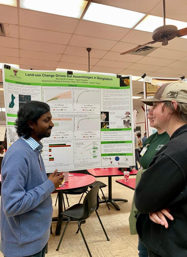 At the 42nd annual Texas Society of Mammalogists meeting in February 2024, Ashraf presented a poster on how bat assemblages are responding to land-use change in Bangladesh. During his two-year adventure in the world of bats, he documented 16 bat species across 5 families and 4 feeding guilds, employing a combination of mist nets and harp traps. His research illustrates that bat species diversity is greater in forests compared to degraded land-use within the protected areas. In addition, Ashraf demonstrated that bat species composition varies across study sites, emphasizing that forested areas are home to specialist bat species, in contrast to degraded sites. Remarkably, Ashraf’s study pioneered the use of the harp trap as a successful method for capturing forest understory bats in Bangladesh, representing a substantial leap forward in the country’s bat research.