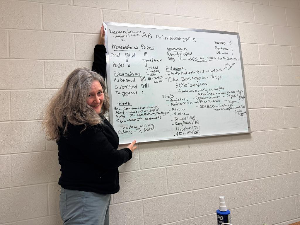 Cheers to 2024, a year filled with achievements! Image Posted on January 5, 2025 by arutrough Whew, what a year! Over 1200 bats, 14 conference presentations, eight published papers, four countries, one coup, one visiting scholar, and a baby. Here’s to keeping it up in 2025! ___ Share this: Click to share on X (Opens in new window) X Click to share on Facebook (Opens in new window) Facebook Like Loading... Related