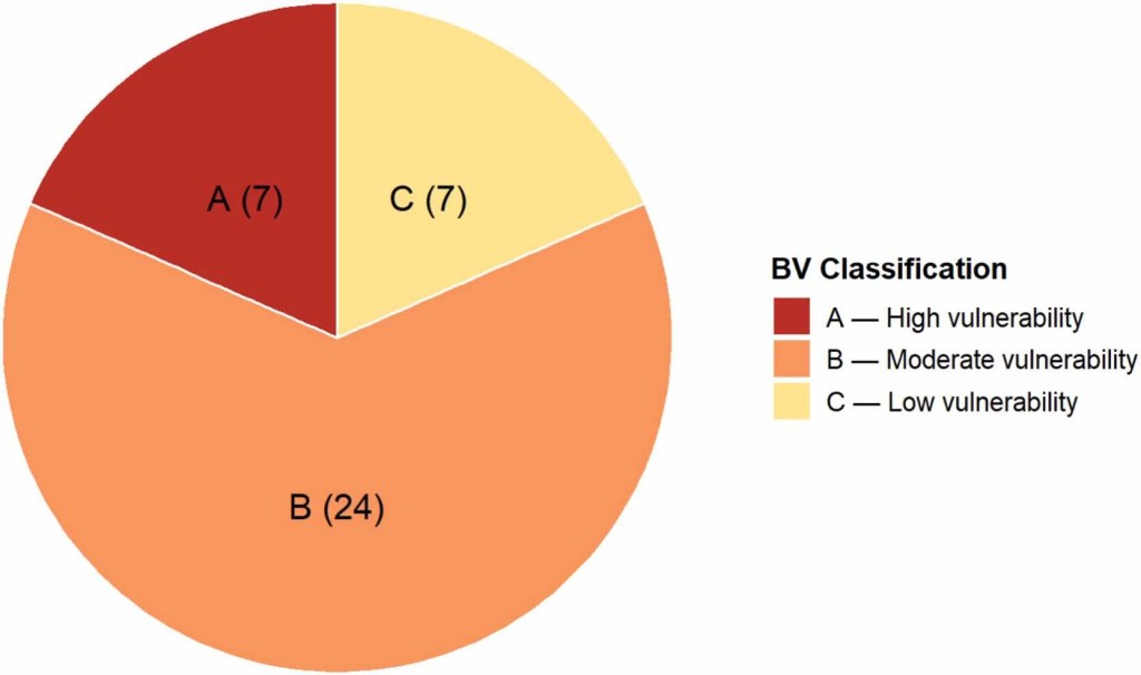 Fig. 2. Distribution of Bat Cave Vulnerability (BV) classes across 38 surveyed caves. BV classes were derived following the Bat Cave Vulnerability Index (BCVI) framework and categorized as A – High vulnerability, B – Moderate vulnerability, and C – Low vulnerability. Numbers in parentheses indicate the number of caves assigned to each class.